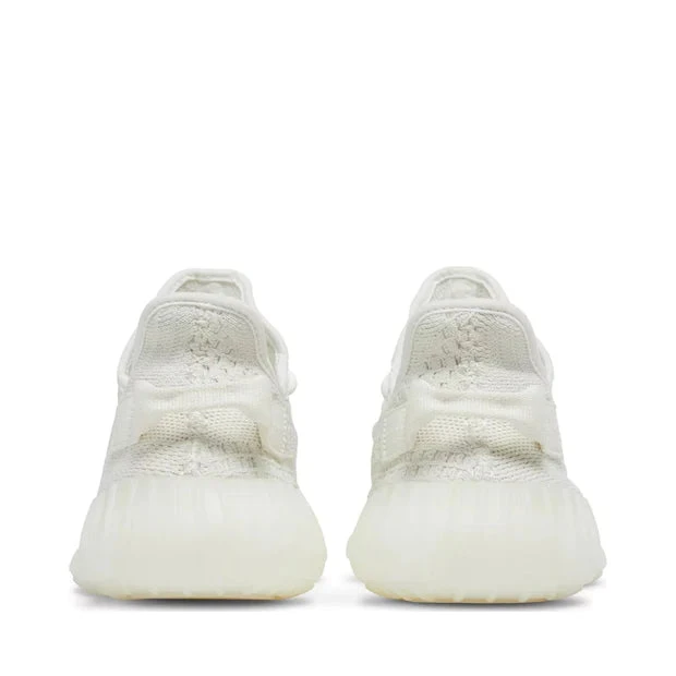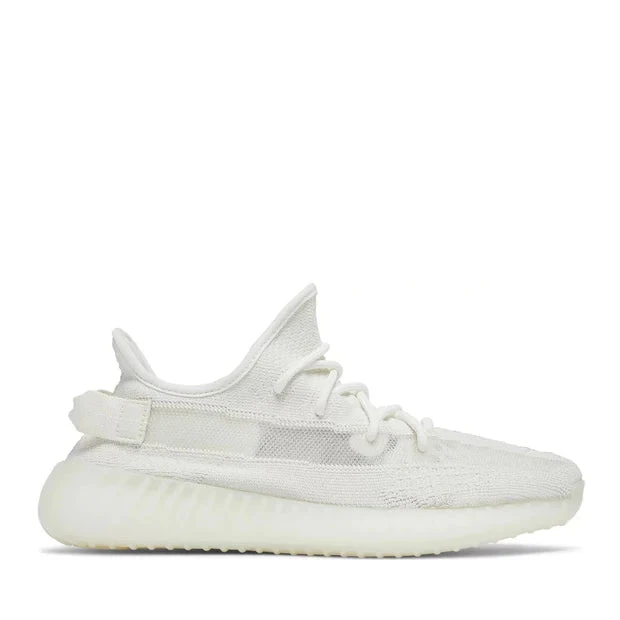 The adidas Yeezy Boost 350 V2 Bone features a triple white Primeknit upper with mesh side stripes and canvas heel tabs. At the base, a semi-translucent sole with Boost technology completes the design.