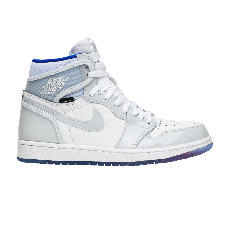 The Air Jordan 1 High Zoom ‘Racer Blue’ updates the iconic silhouette with full-length Zoom Air cushioning and transparent detailing. The latter takes the form of clear overlays on the sneaker’s heel panel and collar flaps, embellished with a Jordan Wings logo on the lateral side. The rest of the upper is constructed from white leather with glossy patent leather overlays in a light grey finish. Underfoot, a translucent rubber outsole is treated to gradient blue-red coloring.