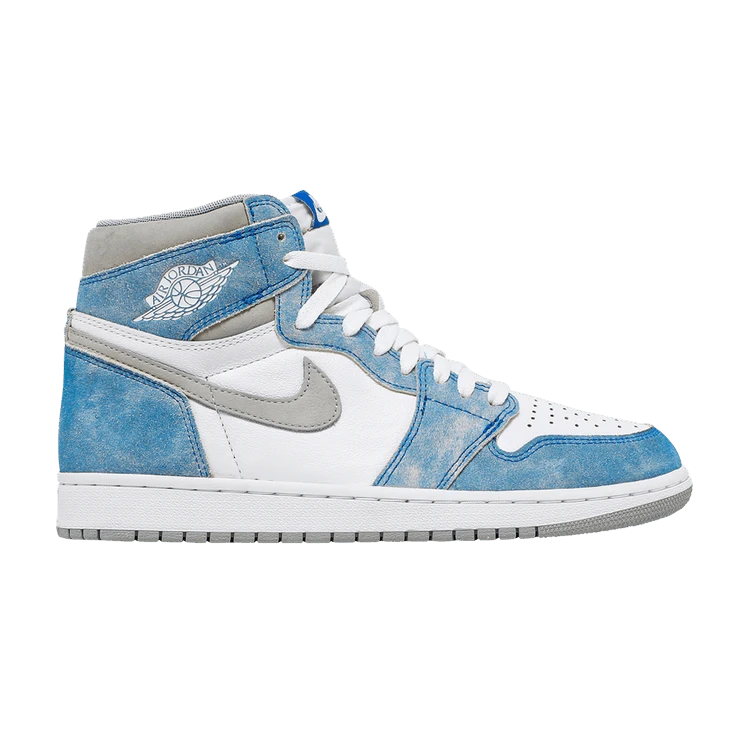 The Air Jordan 1 Retro High OG ‘Hyper Royal’ takes on a weathered aesthetic, highlighted by a white leather upper with faded blue suede overlays. Contrasting neutral grey hits land on the Swoosh and padded collar, adding to the sneaker’s understated palette. OG branding elements include a Jordan Wings logo on the lateral collar flap and a woven Nike tongue tag. The high-top is mounted on a standard AJ1 rubber cupsole, featuring encapsulated Nike Air cushioning in the heel.