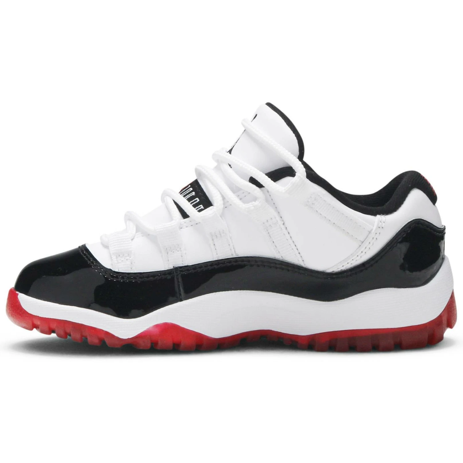 The Jordan 11 Low Concord Bred consists of a white upper with black patent leather overlays and black detailing. A white midsole, red translucent outsole, and Jordan branding on the tongue complete the design.