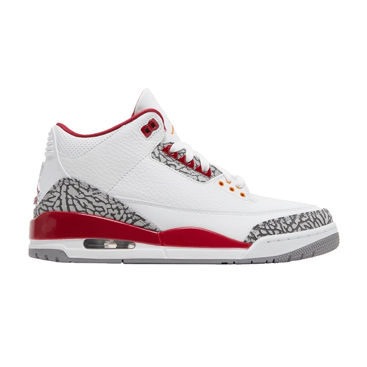 The Air Jordan 3 Retro ‘Cardinal Red’ showcases a distinctive palette influenced by an OG colorway of the Air Jordan 7. The sneaker’s titular hue appears on the collar lining, molded eyelets, and raised Jumpman branding at the heel, all of which are contrasted by a white tumbled leather upper. A second Jumpman icon adorns the tongue in orange embroidery, while the 3’s signature elephant print overlays reinforce the forefoot and heel. The mid-top is mounted on a two-tone polyurethane midsole with a visible Air-sole unit nestled under the heel.