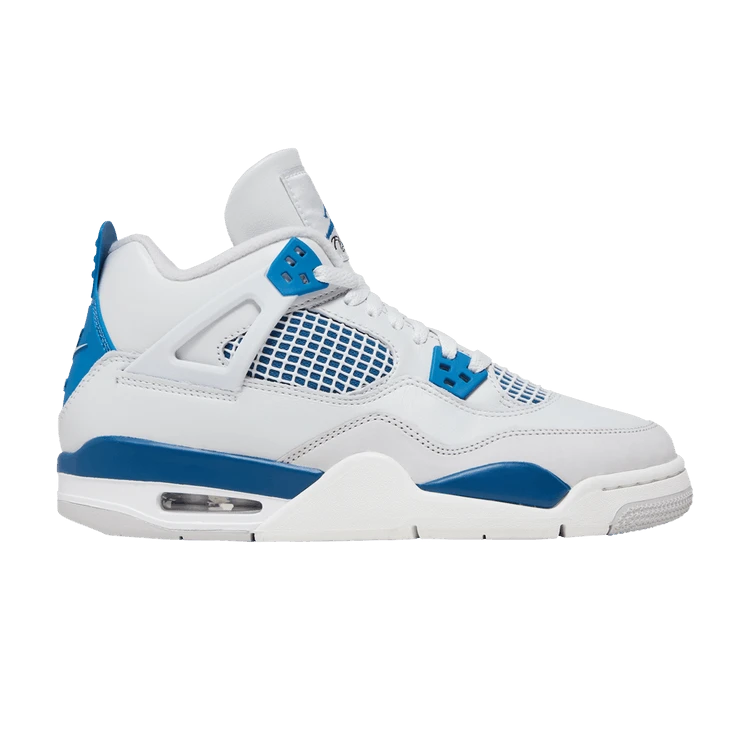Made for big kids, the 2024 reissue of the Air Jordan 4 Retro GS ‘Military Blue’ brings back one of the four OG colorways of the classic silhouette. The off-white leather upper is equipped with TPU support wings and breathable quarter panel netting. Bright blue accents make their way to molded eyelets, a woven Jumpman tongue tag, and a back tab embellished with Nike Air branding. The lightweight polyurethane midsole features a blue topline and exposed Air-sole cushioning in the heel.