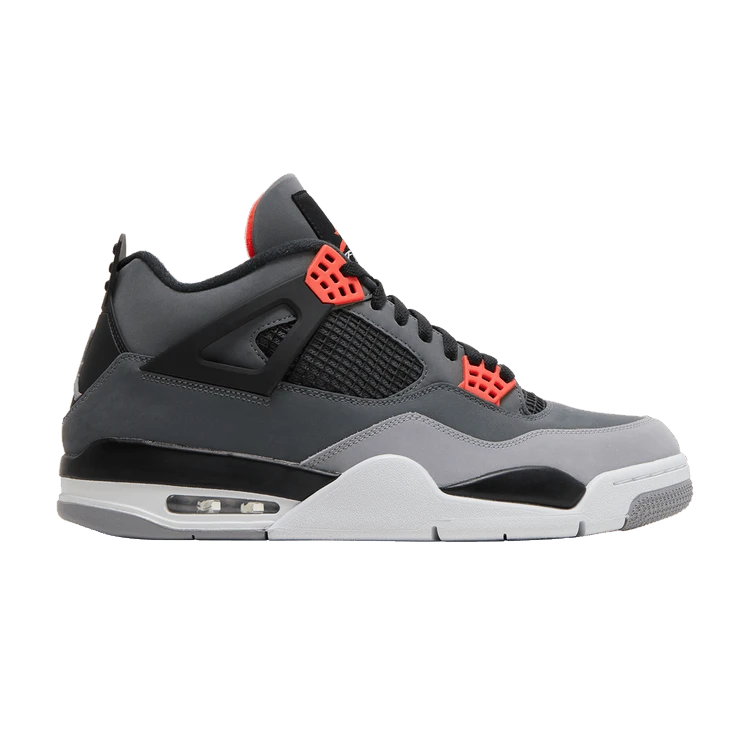 The Air Jordan 4 Retro ‘Infrared’ features distinctive color blocking that recalls the ‘Green Glow’ AJ4 release from 2013. The upper is crafted from smooth nubuck in a charcoal finish. A lighter shade of grey distinguishes the forefoot overlay, while black accents land on the quarter panel netting, structural wings and Jumpman-branded heel tab. The sneaker’s titular hue lights up the woven tongue tag and a quartet of molded eyelets. A polyurethane midsole packs visible Air-sole cushioning in the heel for a smooth ride.