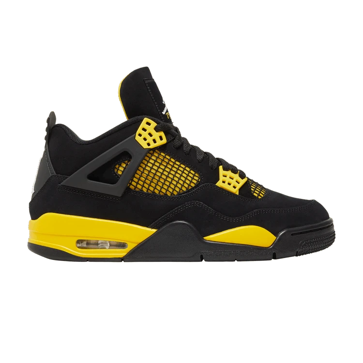 The 2023 edition of the Air Jordan 4 Retro ‘Thunder’ brings back the coveted colorway originally released in 2006 (and previously reissued in 2012). The upper is draped in smooth black nubuck, contrasted by hits of yellow on the molded eyelets, quarter panel, and lower tongue, with the latter two components covered in black netting. Jumpman branding appears on the Flight tongue tag and molded heel tab. Lightweight cushioning comes courtesy of a yellow polyurethane midsole, enhanced with an exposed Air-sole unit in the heel.