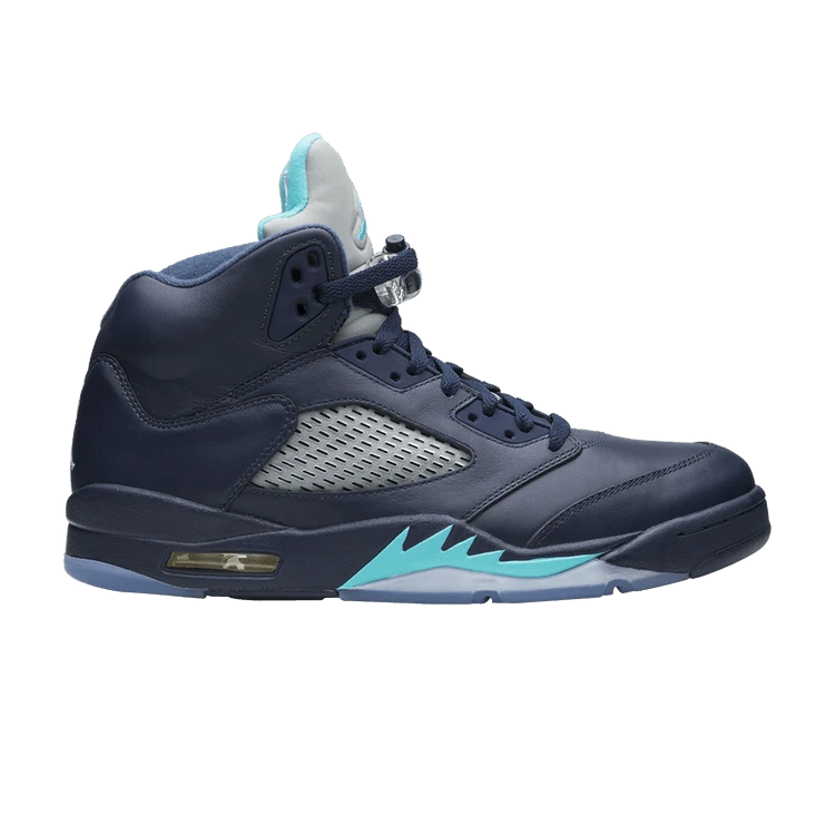 The Nike Air Jordan 5 ‘Pre-Grape’ is inspired by a 1990 Tinker Hatfield sample intended to be released instead of the iconic ‘Grape’ colorway. The sneaker features a Midnight Navy leather upper, grey and turquoise accents, and a 3M reflective tongue. Released in May 2015, the design also includes turquoise shark teeth and an icy blue translucent outsole.