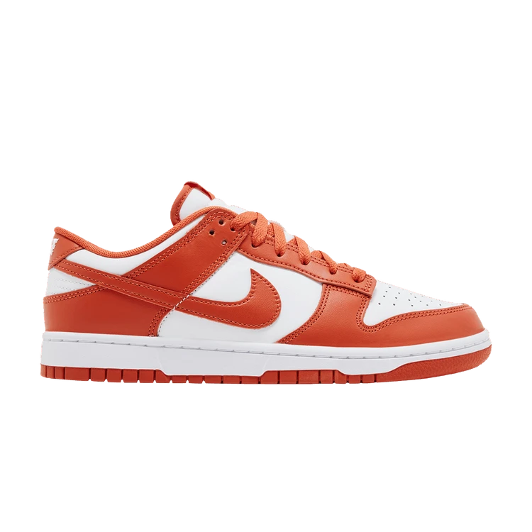The Nike Dunk Low ‘Cosmic Clay’ combines a white base with contrasting orange overlays at the forefoot and heel. The citrus hue is repeated on the textile collar lining, signature Swoosh and back tab, marked with embroidered Nike branding. A woven Nike tag adorns the breathable nylon tongue. A durable rubber cupsole underpins the retro silhouette.