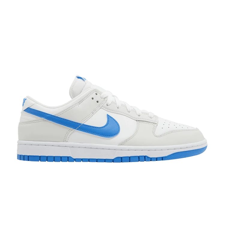 The Nike Dunk Low ‘Photo Blue’ blends the shoe’s timeless lines with a simple two-tone color scheme. The leather upper features a stark white base with subtle Platinum Tint overlays at the forefoot and heel. Vibrant blue accents settle on the sneaker’s branding elements, including the signature Swoosh, woven Nike tongue tag, and the Nike wordmark embroidered on the back tab. The low-top is supported by a standard rubber cupsole, fitted with an interior foam wedge for lightweight cushioning.