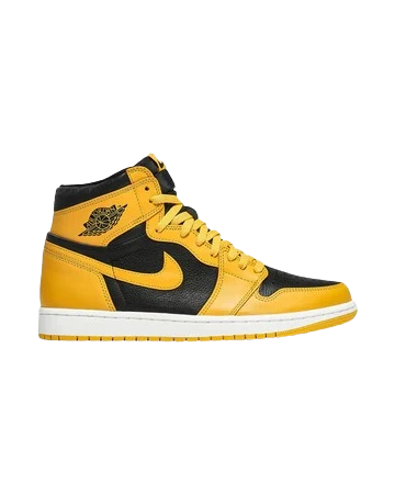 The Air Jordan 1 High Retro OG ‘Pollen’ showcases color blocking that mirrors another basketball silhouette released back in 1985. Recalling the OG ‘Iowa’ Dunk colorway, the leather upper pairs a solid black base with contrasting overlays in Pollen yellow. Traditional branding elements include a Jordan Wings logo imprinted on the lateral collar flap and a woven Nike tag atop the nylon tongue. The high-top rides on a standard rubber cupsole, enhanced with a polyurethane wedge and encapsulated Air-sole cushioning under the heel.