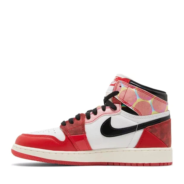 Spider-Man: Across the Spider-Verse is referenced in the collaborative colorway of the Marvel x Air Jordan 1 Retro High OG “Next Chapter.” This reinvented version of the shoe icon plays off the original “Chicago” hue and has a white leather upper with black patent leather on the collar and Swoosh. Scarlet overlays have a piecemeal design that references to the multidimensional Spiderman realm. They are made up of a patchwork mixture of various textures and prints. The nylon tongue is embellished with a woven Nike tag, and the lateral collar flap bears a vintage Wings emblem. The high-top is supported by a rubber cupsole with worn sides and a semi-translucent red rubber outsole.
