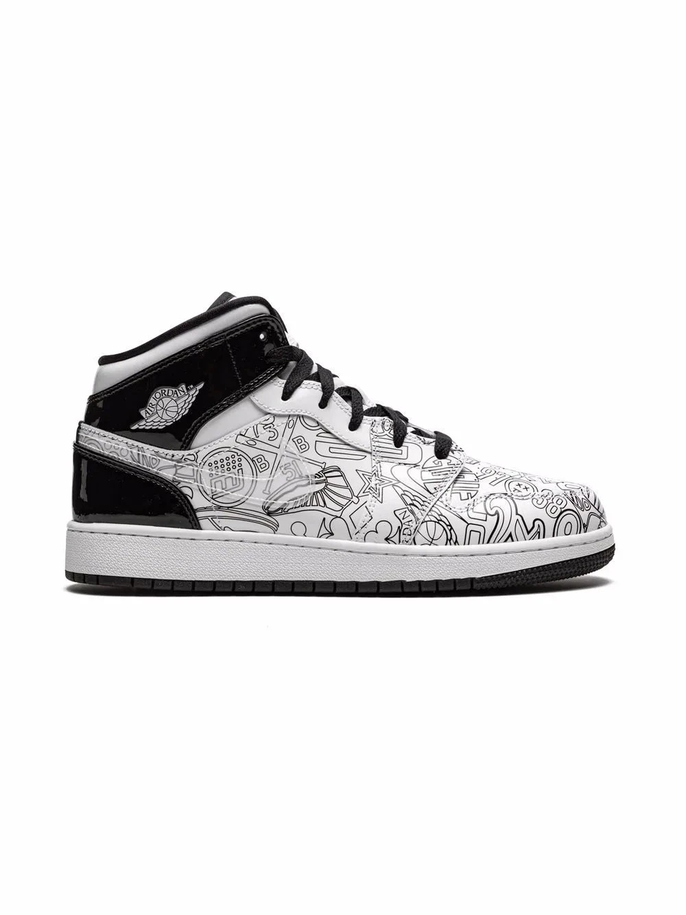 Although they seem simple, these Air Jordan 1 Midact as a colouring book that turned into a sneaker. Here, thinly penned graphics adorn the entire forefoot and much of the profile, mirroring the prints and patterns found in the aforementioned. The white backdrop only serves as inspiration, allowing anyone to infuse their own personality and style. Behind, the ankle flap, heel, laces, and lining are not quite as customizable, their blacked-out finishes serve only a stage for the usual Wings and Jumpman branding.