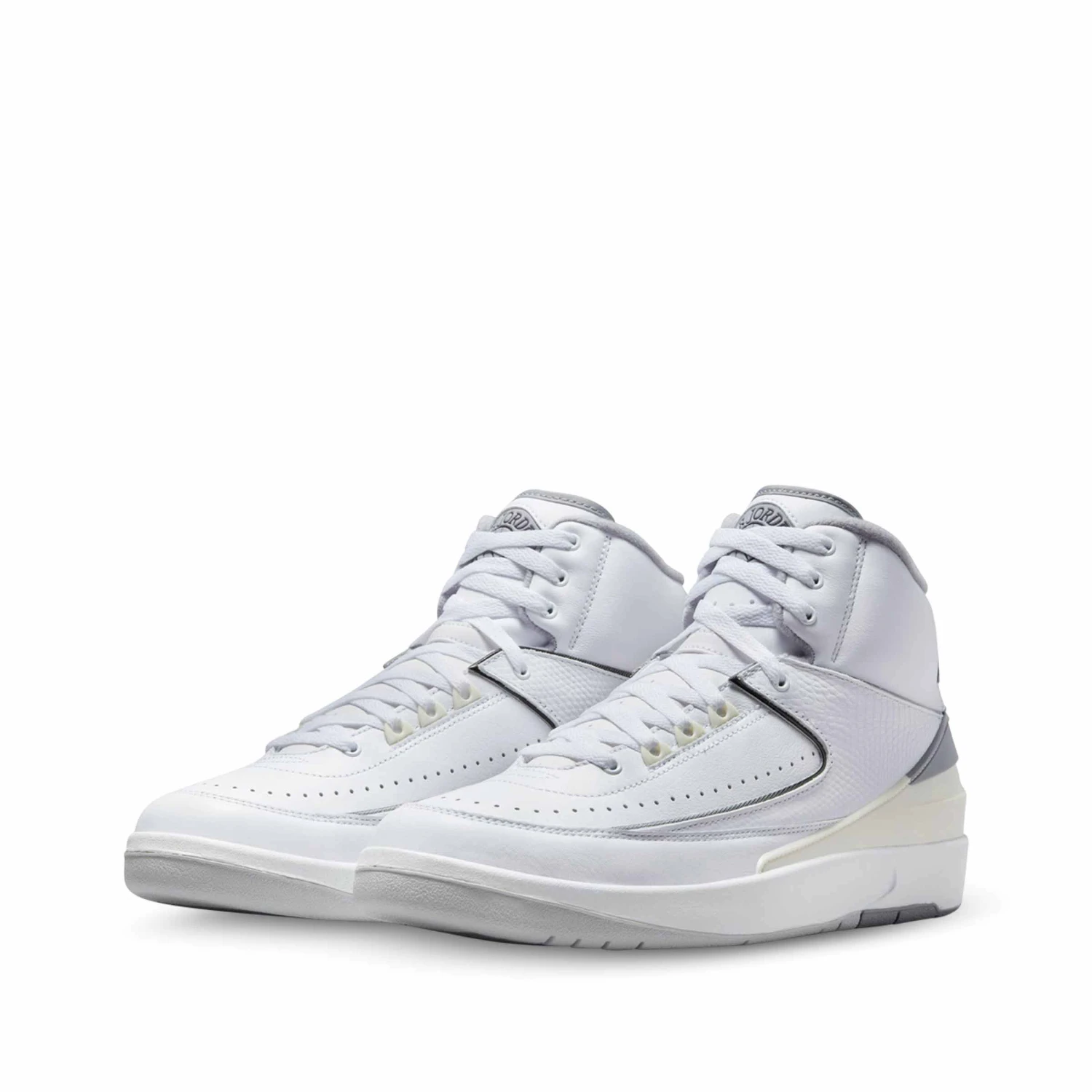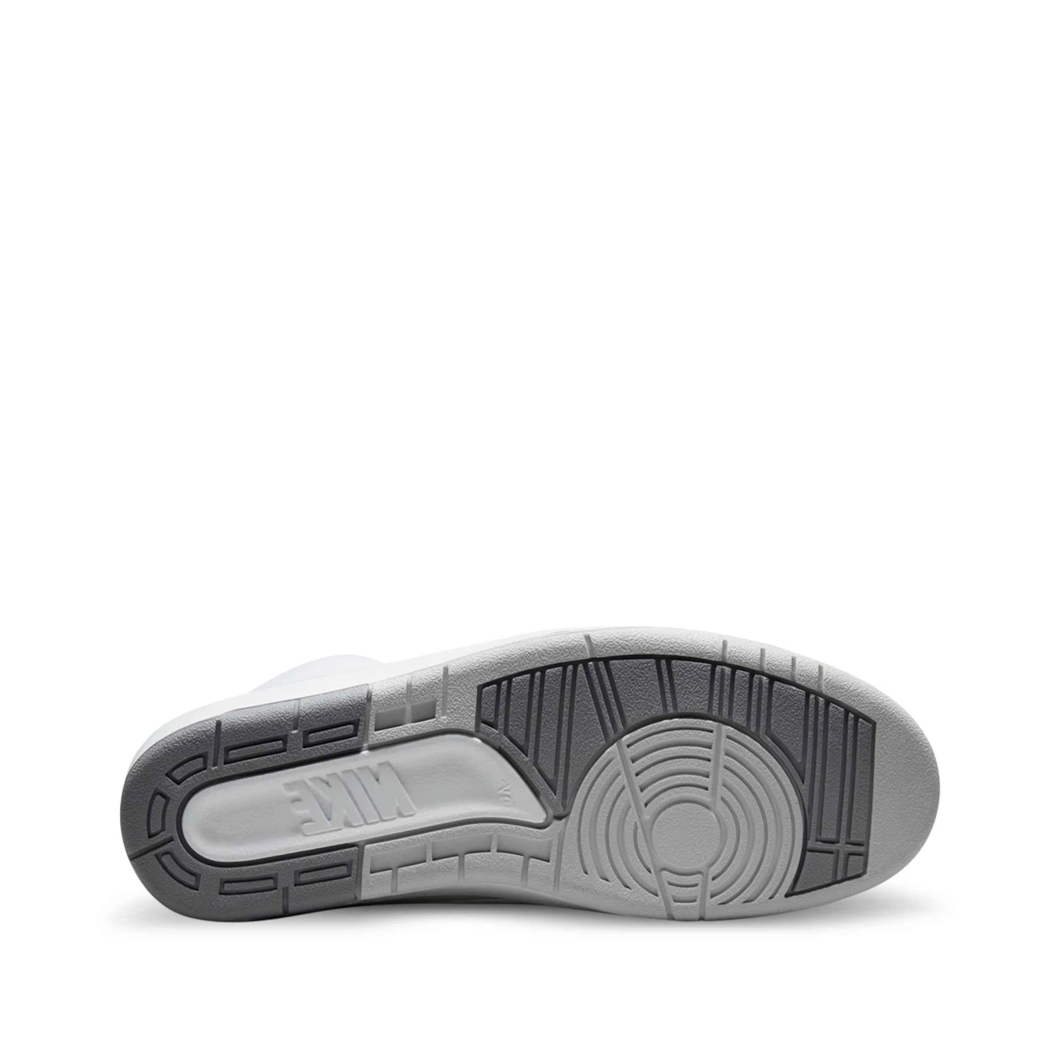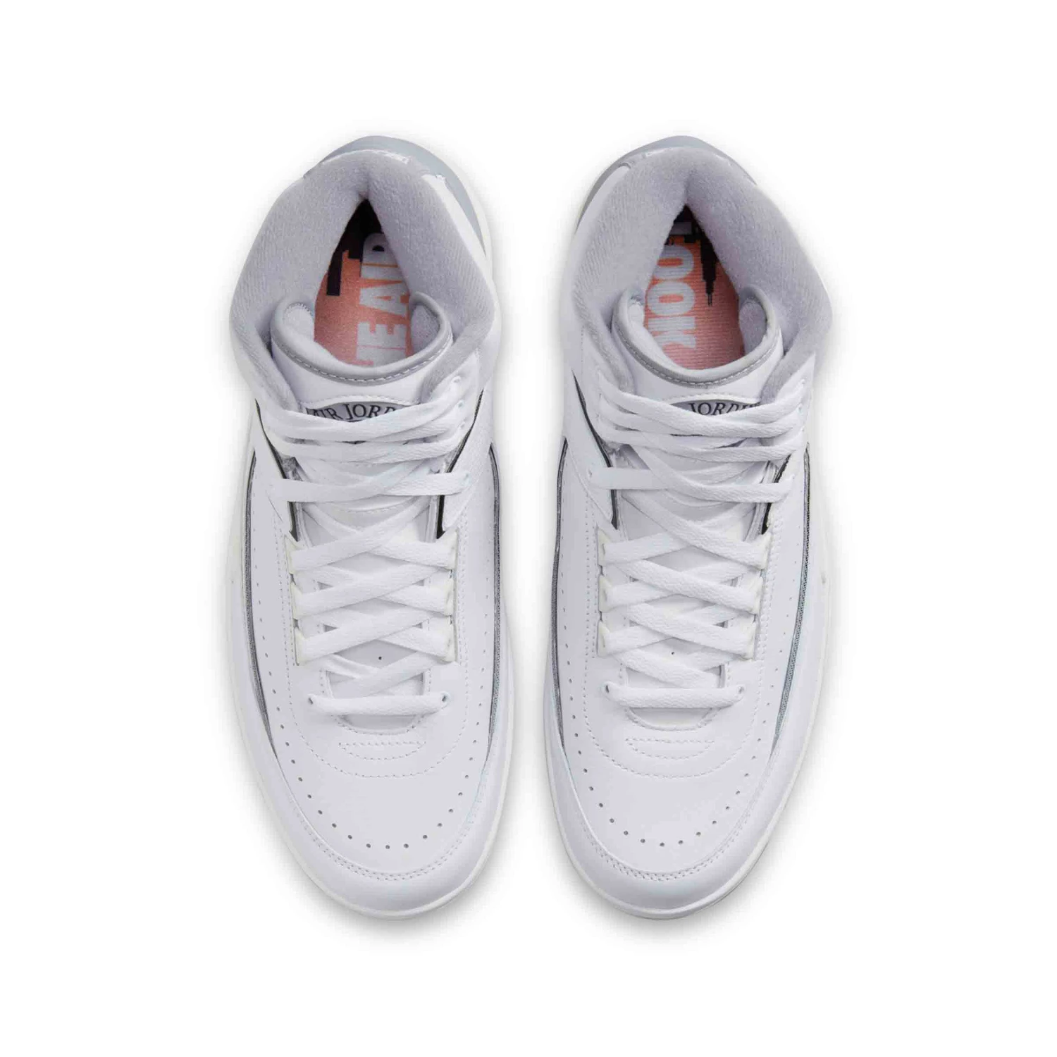 Dressed in a White, Cement Grey, Sail, and Black color scheme. This Air Jordan 2 features a White leather base with Grey detailing, Black Wings and pipping. A Sail heel counter atop a Grey rubber outsole with a skyline graphic insole that reads, “Look, Up In The Air” completes the design.