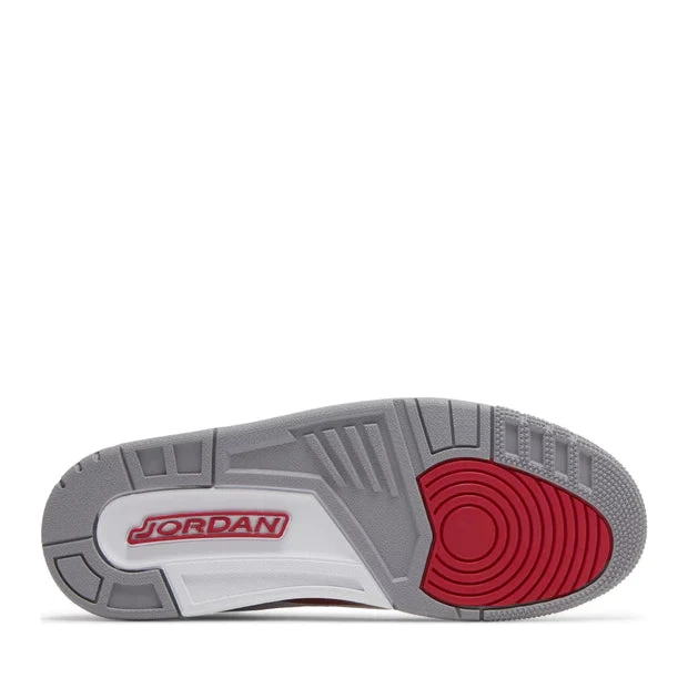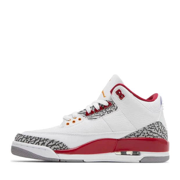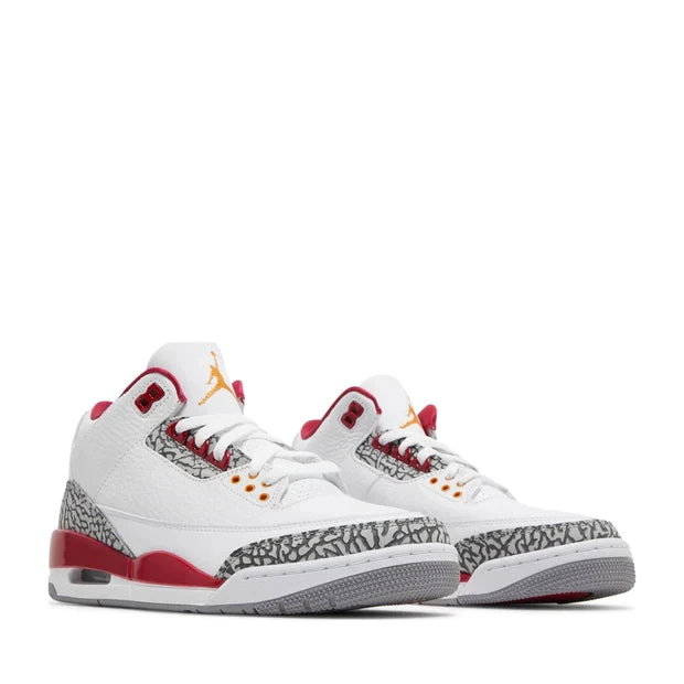 Constructed with white tumbled leather and signature Elephant Print overlays, the Air Jordan 3 Cardinal Red takes a traditional approach in its color blocking and fabrication, similar to the iconic Black Cement 3s. Spicing up the design, sharp Cardinal Red midsoles and detailing pop against the neutral toned upper. Bright orange Jumpman logo embroidery on the tongue adds the finishing touch.