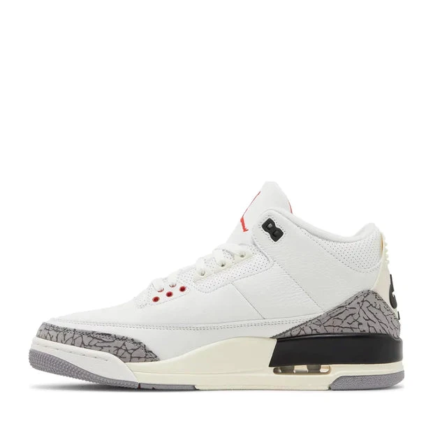 The Air Jordan 3 Retro ‘White Cement Reimagined’ brings back one of the original colorways, celebrating the 35th anniversary of the AJ3. Designed by Tinker Hatfield, the Reimagined iteration is built to the original 1988 specs. Returning true to form, the white leather upper pairs with elephant print overlays on the heel and toe while hits of Varsity Red appear on the lace loops and the Jumpman logo on the tongue. Nike Air is emblazoned on the back heel tab, while a visible Air unit provides lightweight cushioning. A slight hint of yellowing appears on the back heel and midsole, giving the shoe a vintage look.