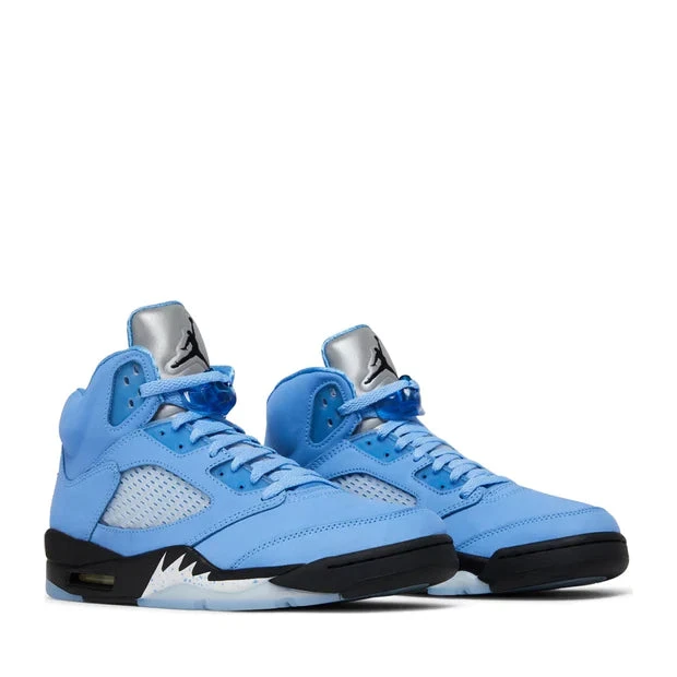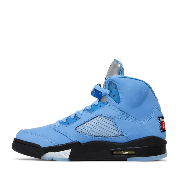 The Air Jordan 5 Retro SE ‘UNC’ showcases a familiar pastel hue inspired by Michael Jordan’s alma mater. The upper is crafted from University Blue nubuck with tonal TPU eyelets, ventilated quarter-panel netting and a woven jock tag at the heel. An embroidered Jumpman decorates the tongue, rendered in a reflective silver finish for added visibility in low-light conditions. Lightweight cushioning comes courtesy of a black polyurethane midsole, accented with speckled shark-tooth detailing and fitted with a visible Air-sole unit in the heel. Underfoot, a translucent herringbone-traction outsole provides optimal grip.