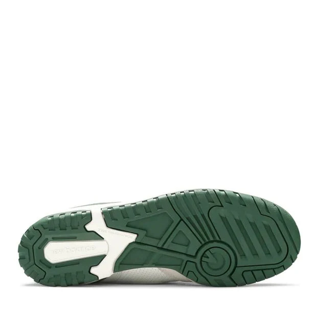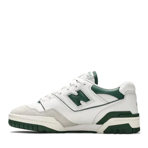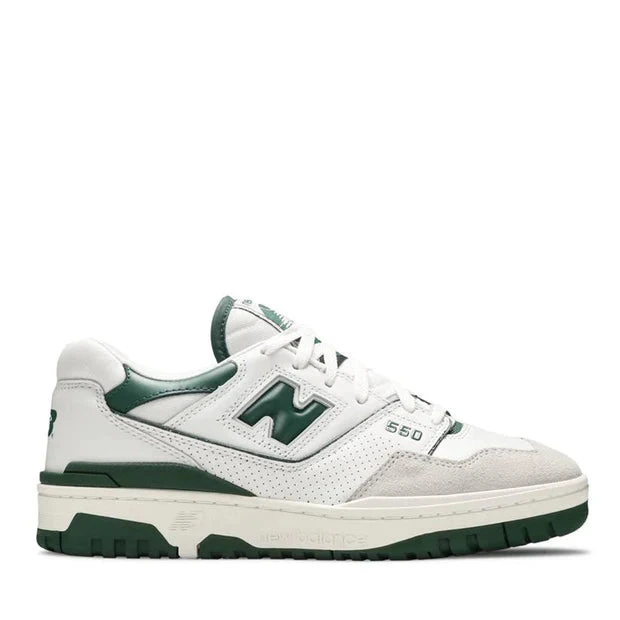 The New Balance 550 White Green features a smooth white leather upper with a grey suede toe wrap and green detailing. From there, a New Balance Basketball woven tongue label and matching sole completes the design
