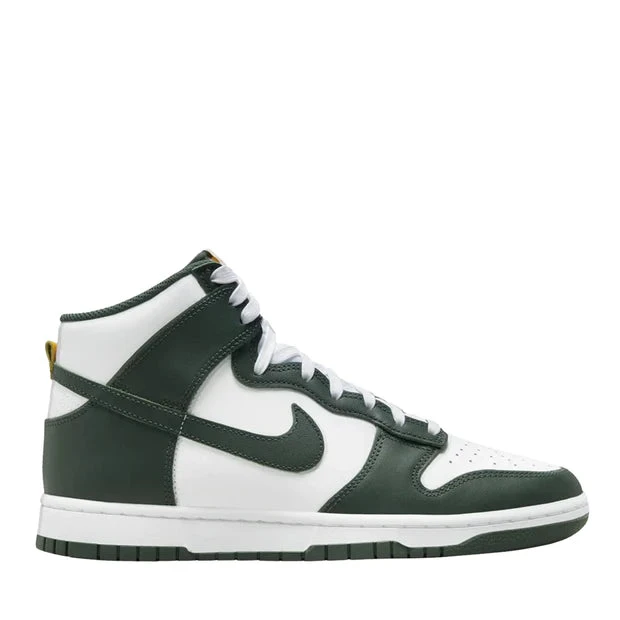 The Nike Dunk High Australia arrives with a white and dark green smooth leather upper in a traditional two-tone color blocking style. Hits of yellow on the heel tab and woven tongue label add slight contrast. From there, a white and dark green Air Sole provides support and durability.