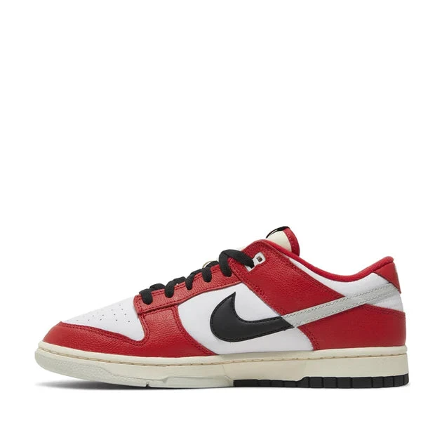 The Nike Dunk Low ‘Chicago Split’ showcases an instantly recognizable palette forever linked to the iconic Air Jordan 1. The leather upper features a crisp white base with contrasting overlays in University Red. A split leather Swoosh cuts across the side panel in black and Light Silver. The split-design theme extends to the Nike branding hits on the tongue tag and back tab, celebrating Nike’s past and present. A vintage off-white finish is applied to the midsole, reinforced underfoot by a two-tone rubber outsole.