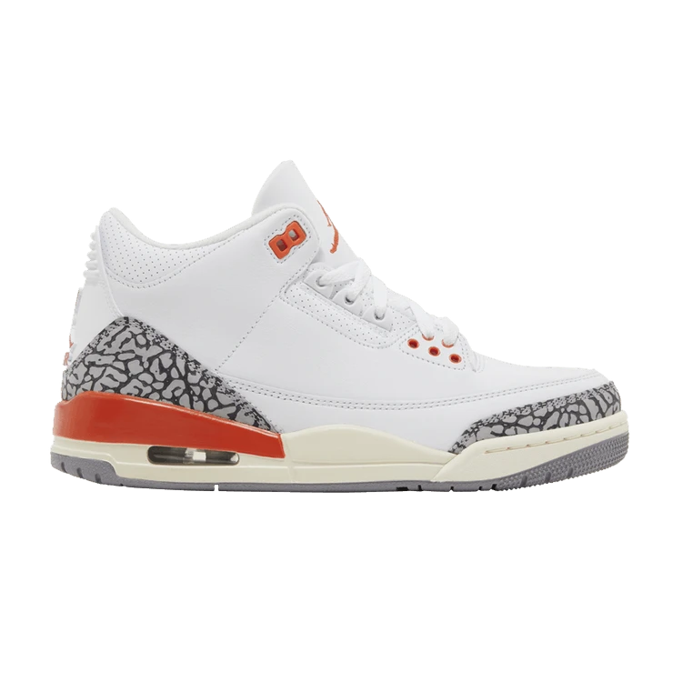 The Women’s Air Jordan 3 Retro ‘Georgia Peach’ showcases a white tumbled leather upper, contrasted by orange molded eyelets and fortified with grey elephant print overlays at the forefoot and heel. Jumpman branding adorns the tongue and back heel. A vintage off-white finish is applied to the polyurethane midsole, featuring visible Air-sole cushioning and a wraparound splash of Cosmic Clay.